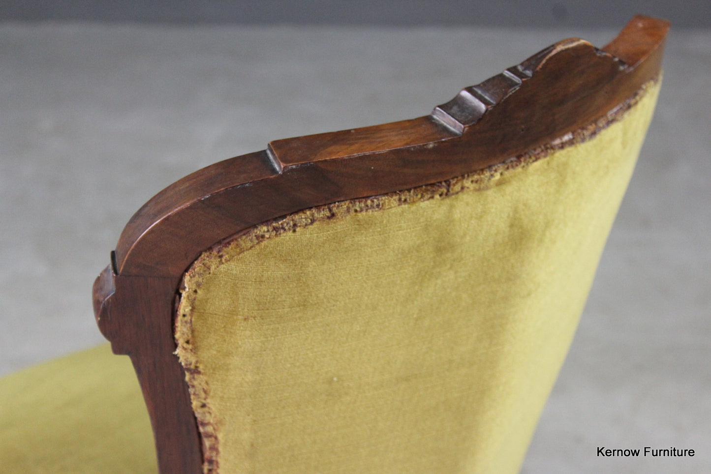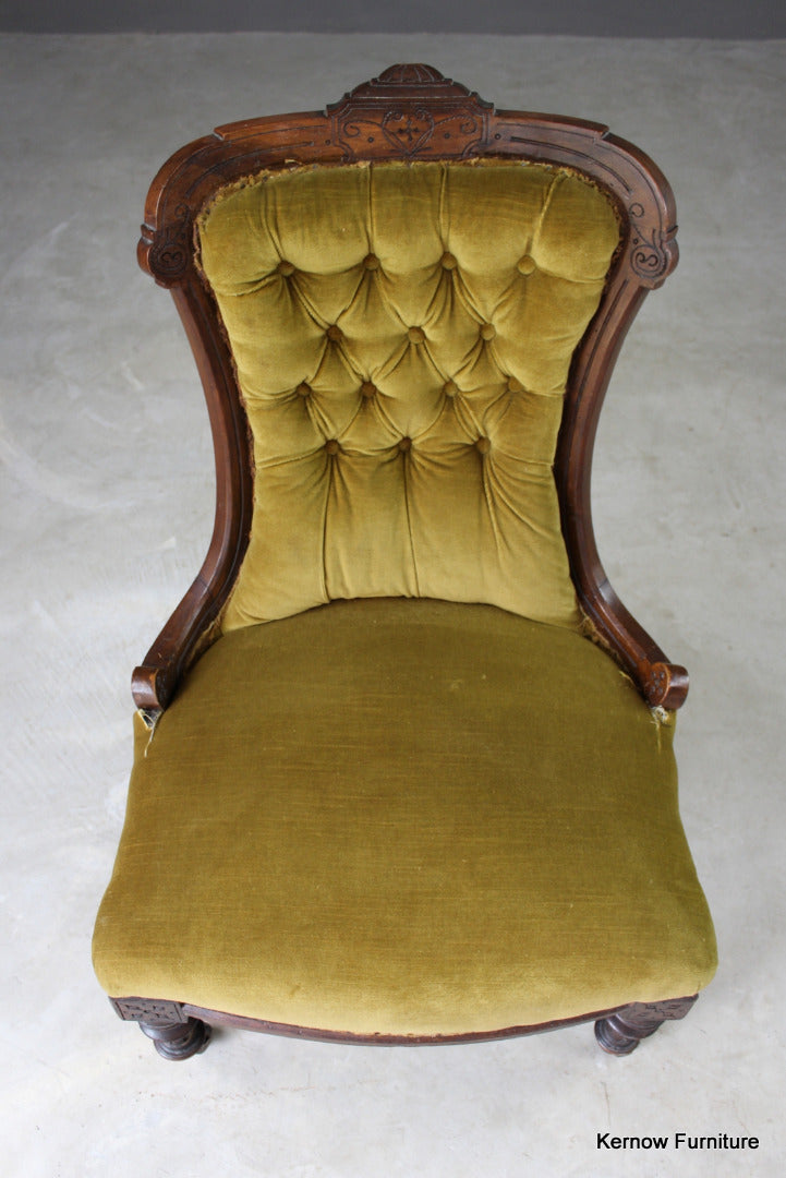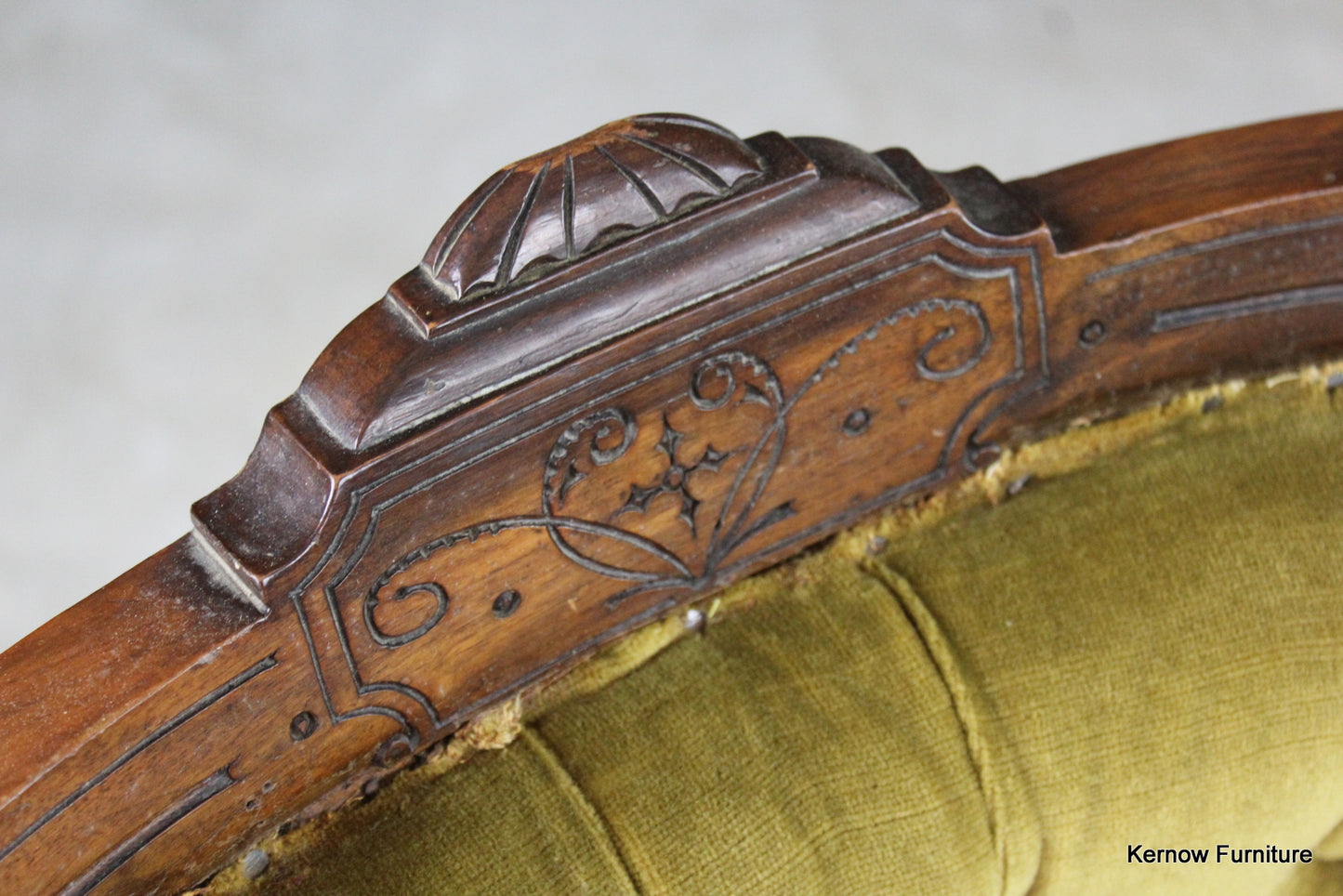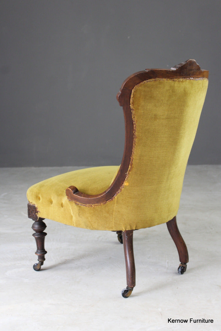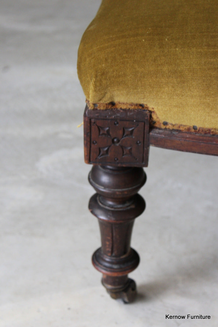 Victorian nursing chair. Antique Victorian nursing chair, upholstered in mustard dralon, carved mahogany frame with button back, sprung seat, on short turned legs.