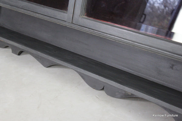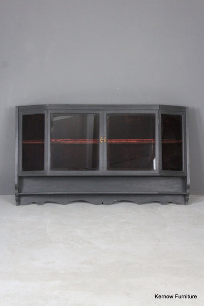 Victorian painted wall mount cabinet. Antique painted wood, off black wall mounted display cabinet with canted front and bevelled glass panels enclosing a red velvet lined interior, with open shelf below.