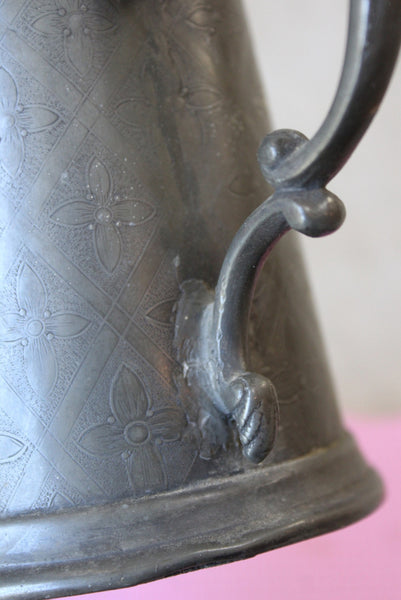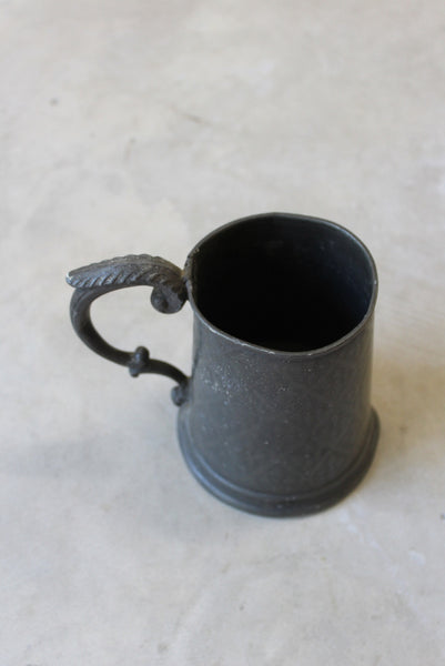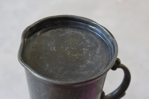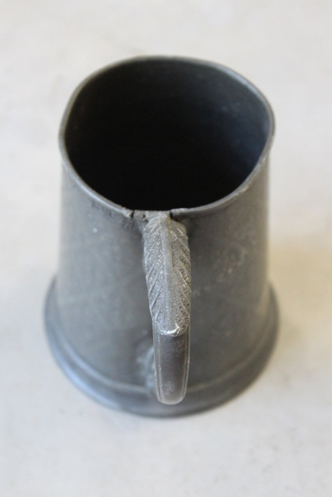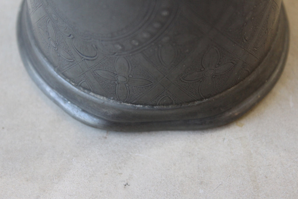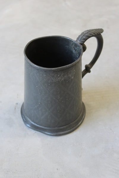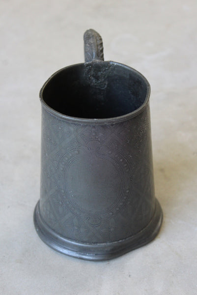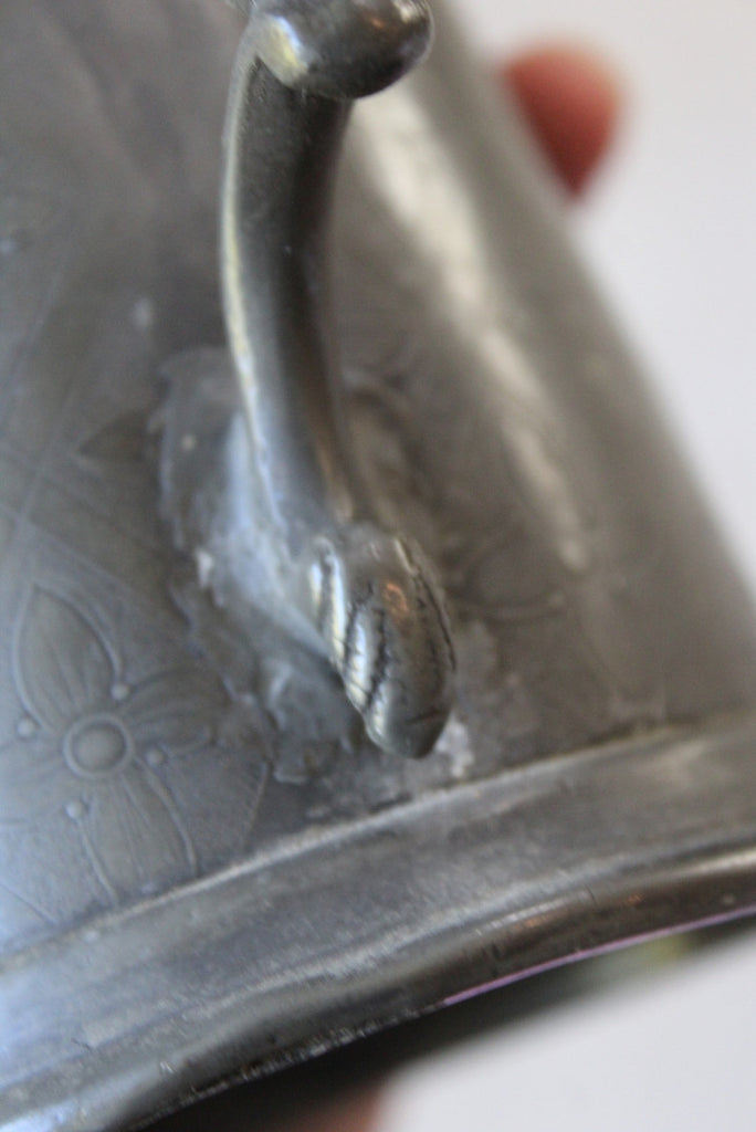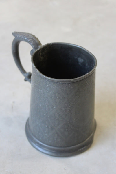 Victorian pewter pint tankard. Stamped VR PINT 466. Etched floral design.