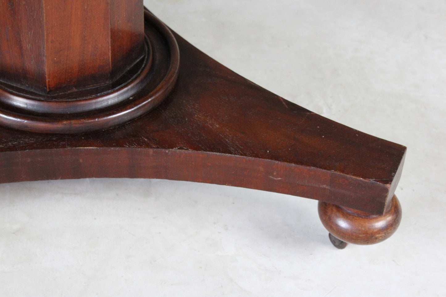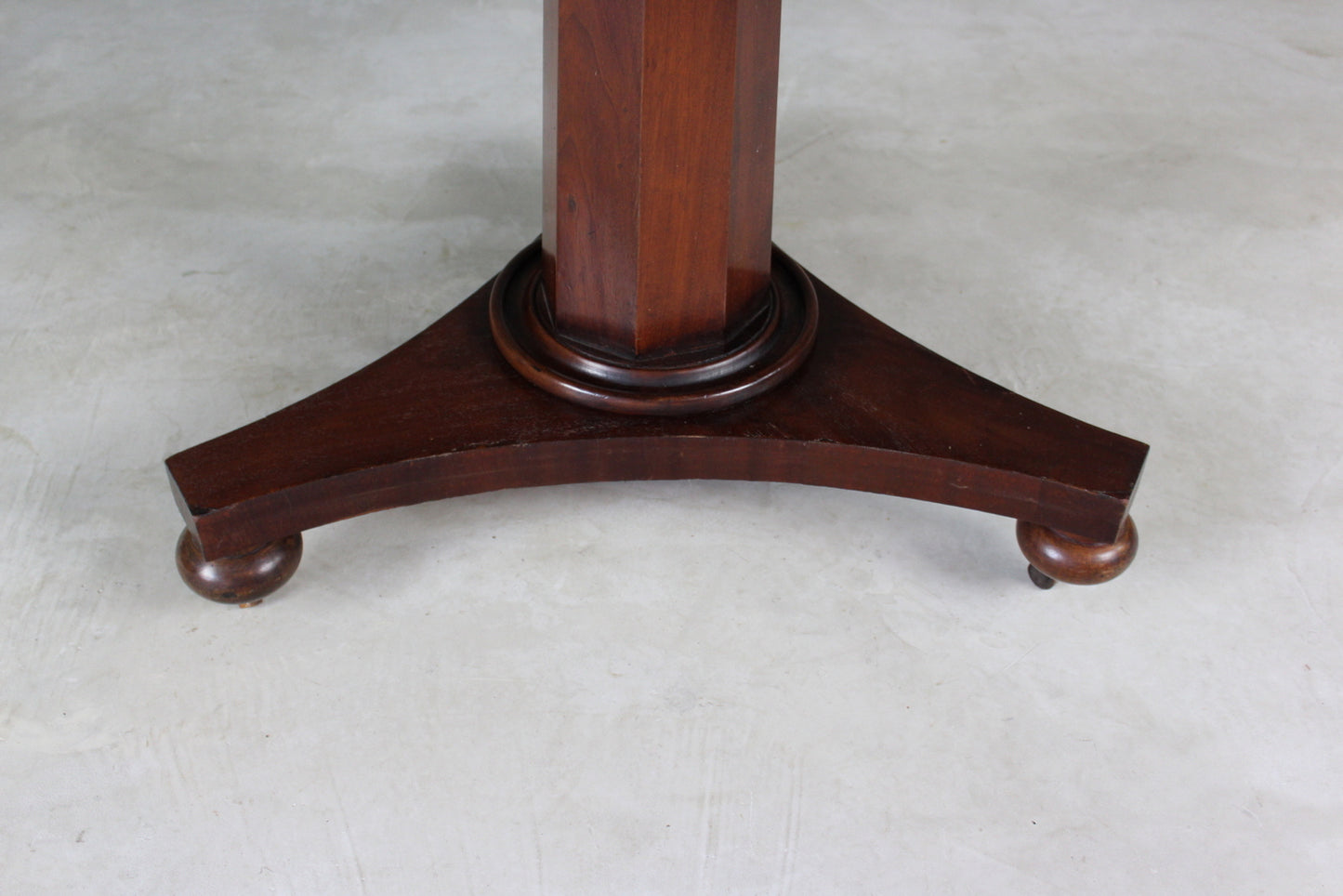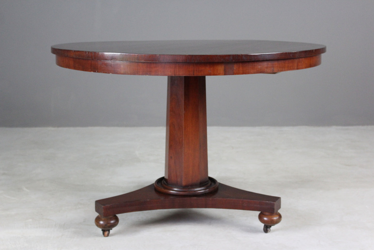 Victorian round tilt top. Antique round breakfast table, mahogany veneer with octagonal column on triform base and small bun feet and castors.