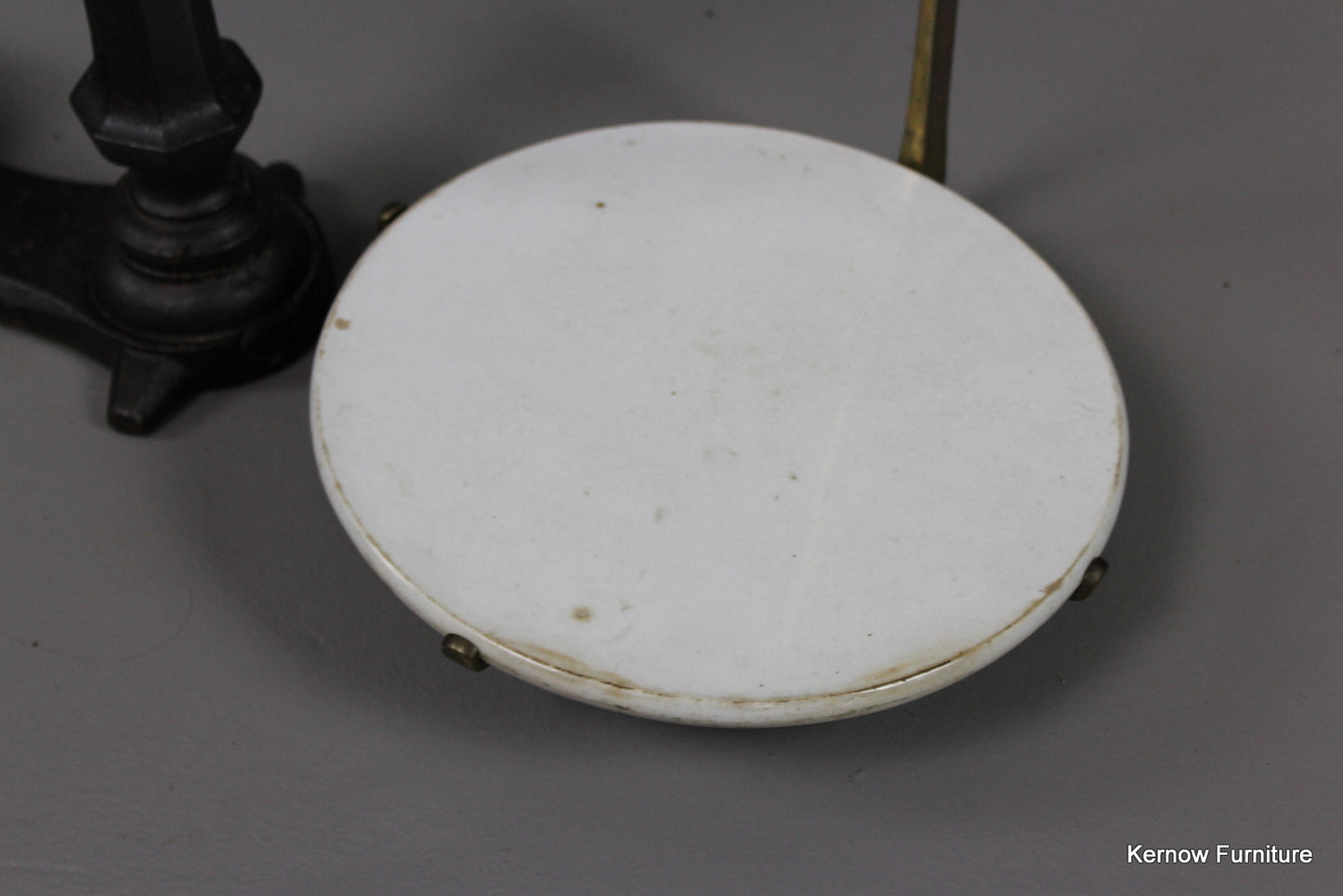 Antique Victorian shop counter beam balance scales with porcelain slab.