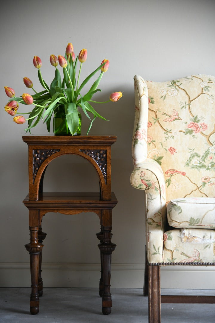 Victorian Square Oak Side Table. Good quality Victorian occasional table, square top with arcaded lower tier on turned supports decorated with carved floral decoration.