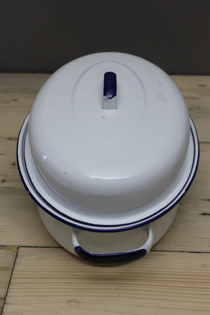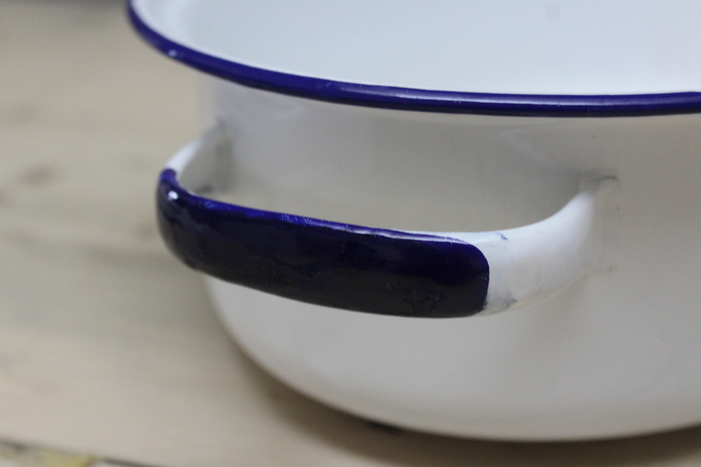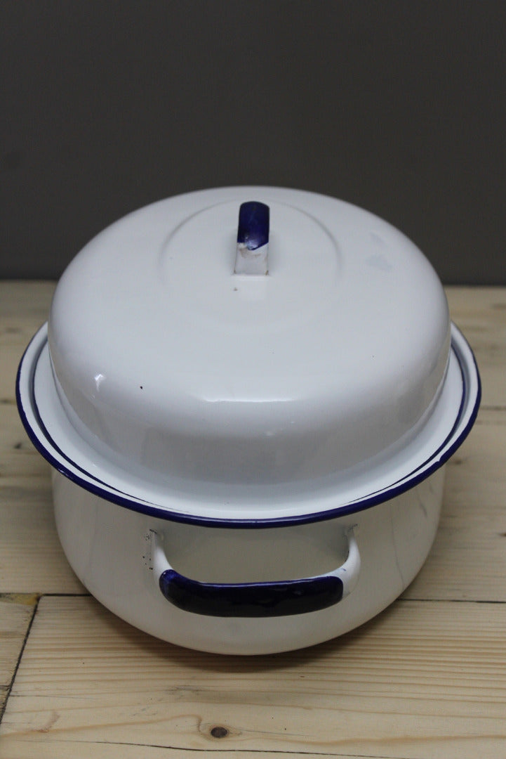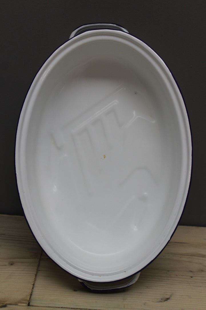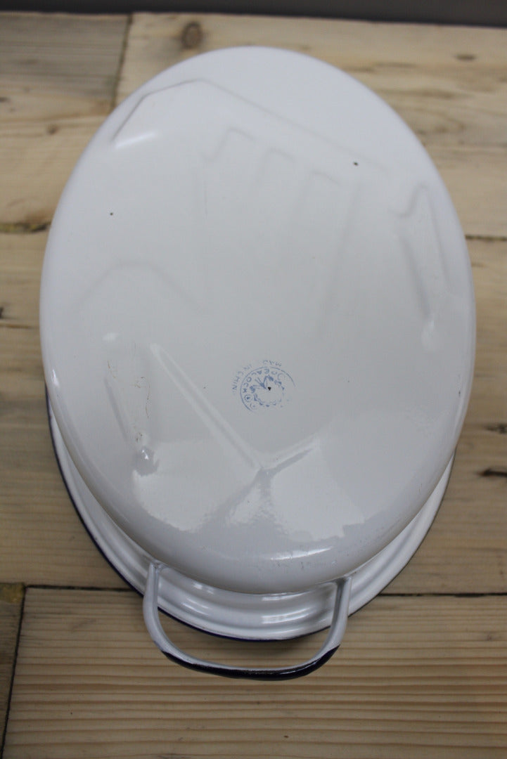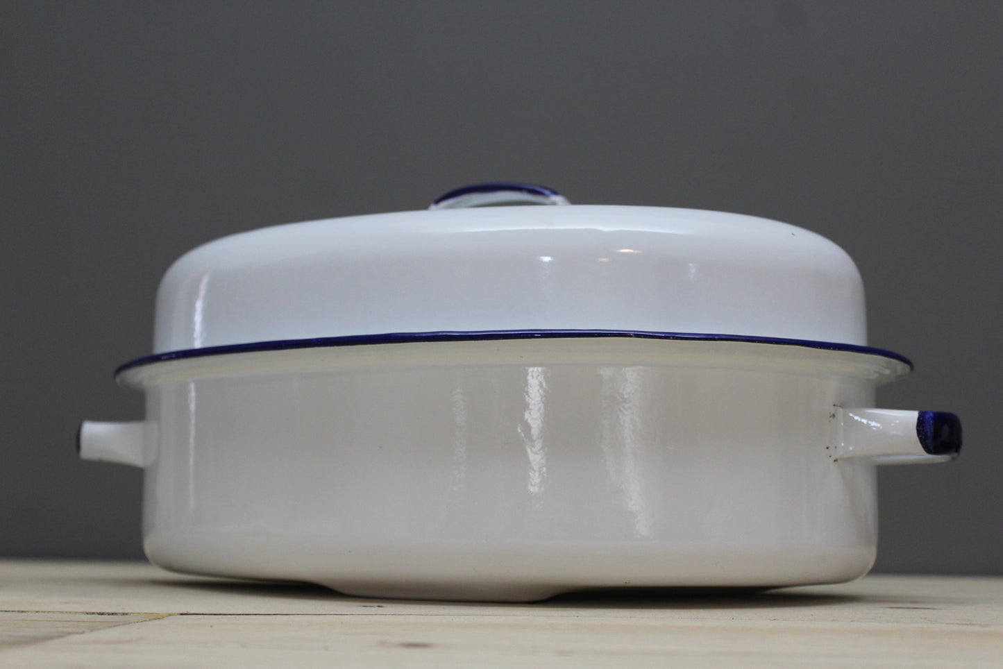 Vintage enamel roaster. Oval white enamel roaster with blue handles.