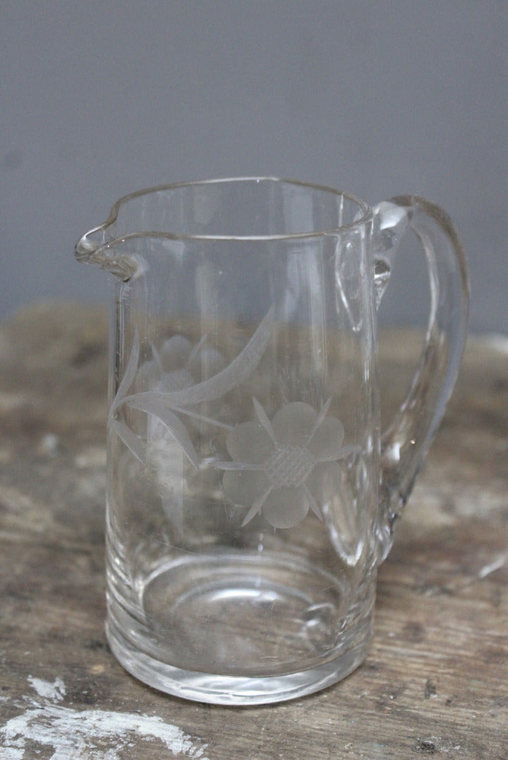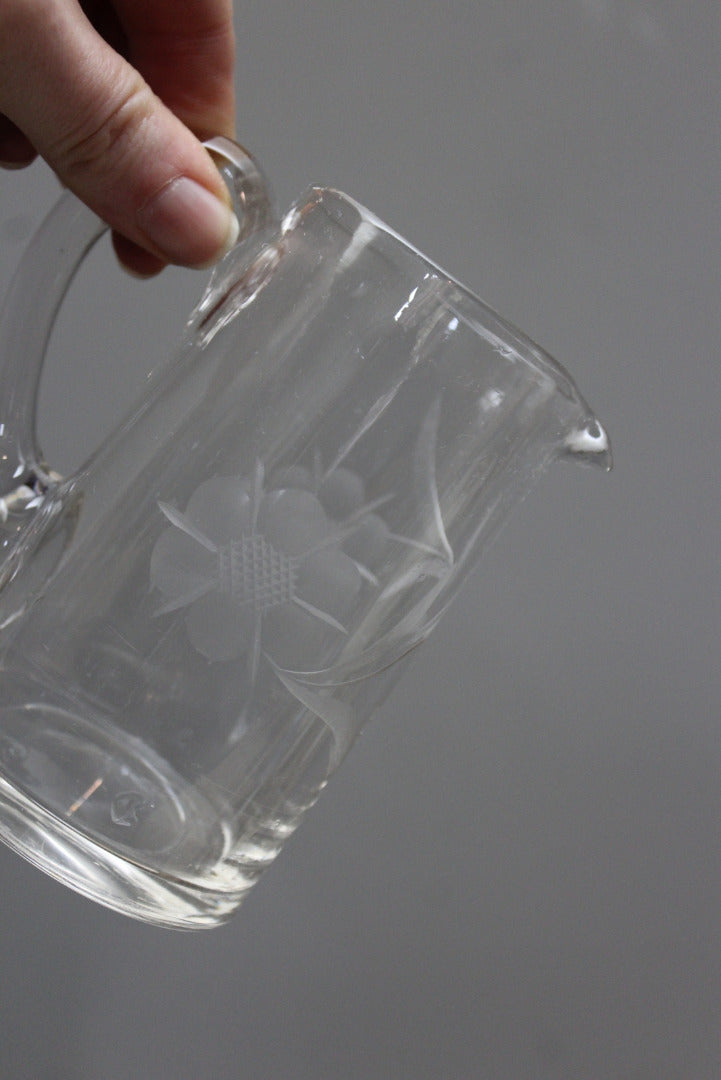 Vintage etched glass jug & stemmed bowl. Clear glass matching small jug and bowl, etched floral design.