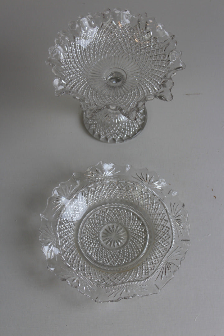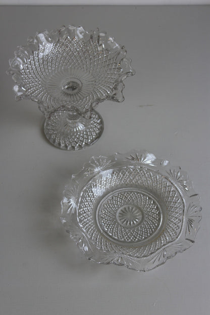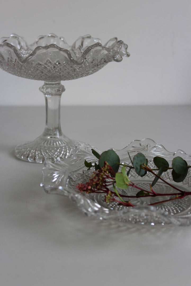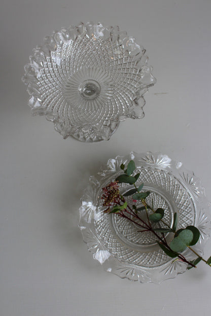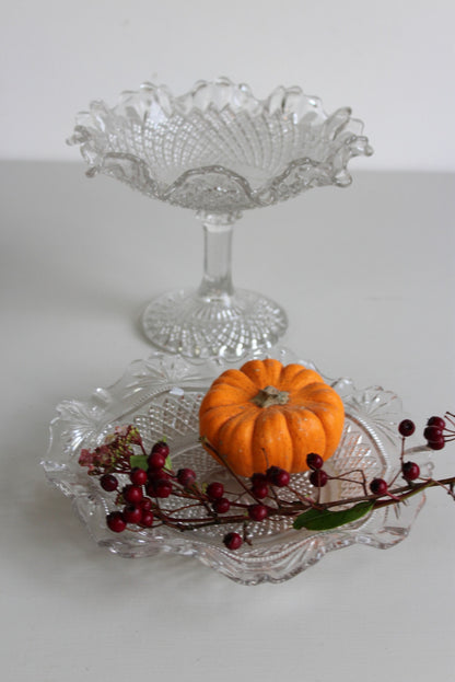 Vintage Glass Dish & Bon Bon Dish. Vintage clear pressed glass flat dish with frilly edge and stemmed glass bon bon dish.