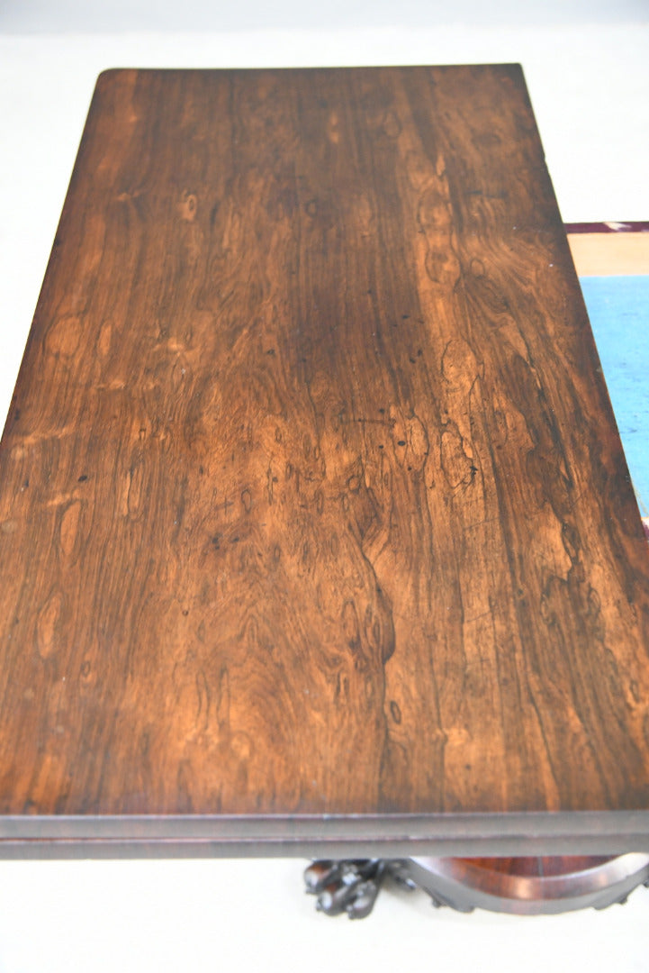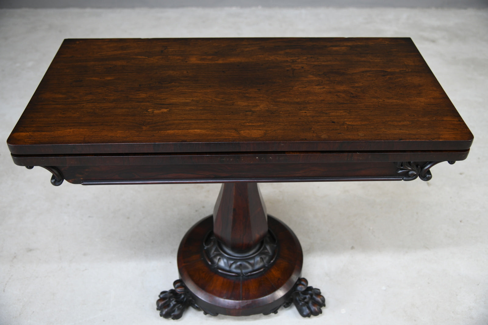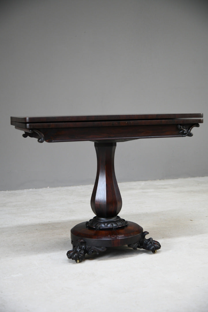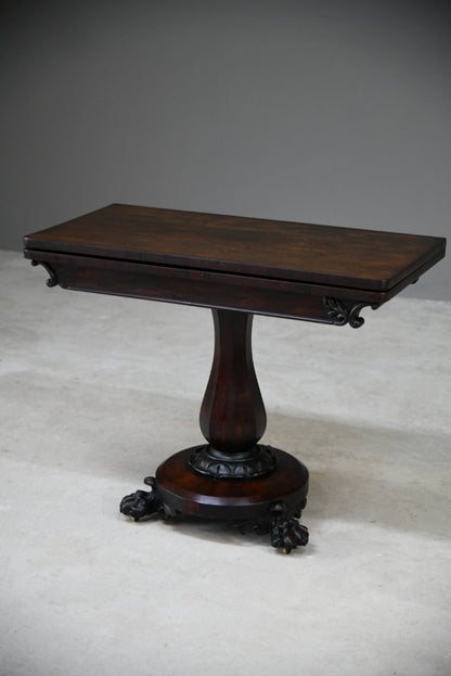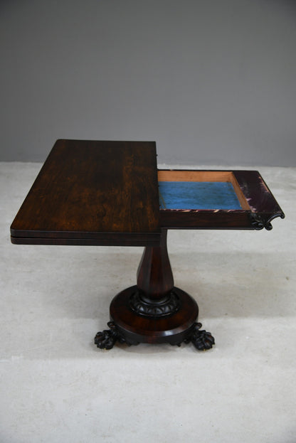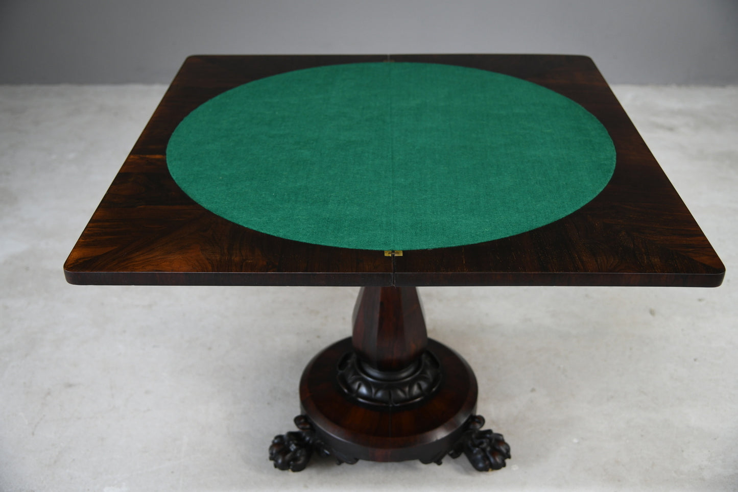 William IV Rosewood Games Table. Antique William IV Rosewood card table with fold over top with green baize lined centre on bulbous column round base and three carved lion paw feet.