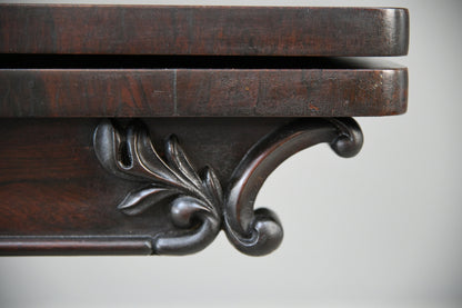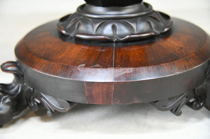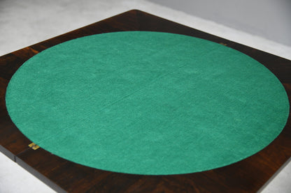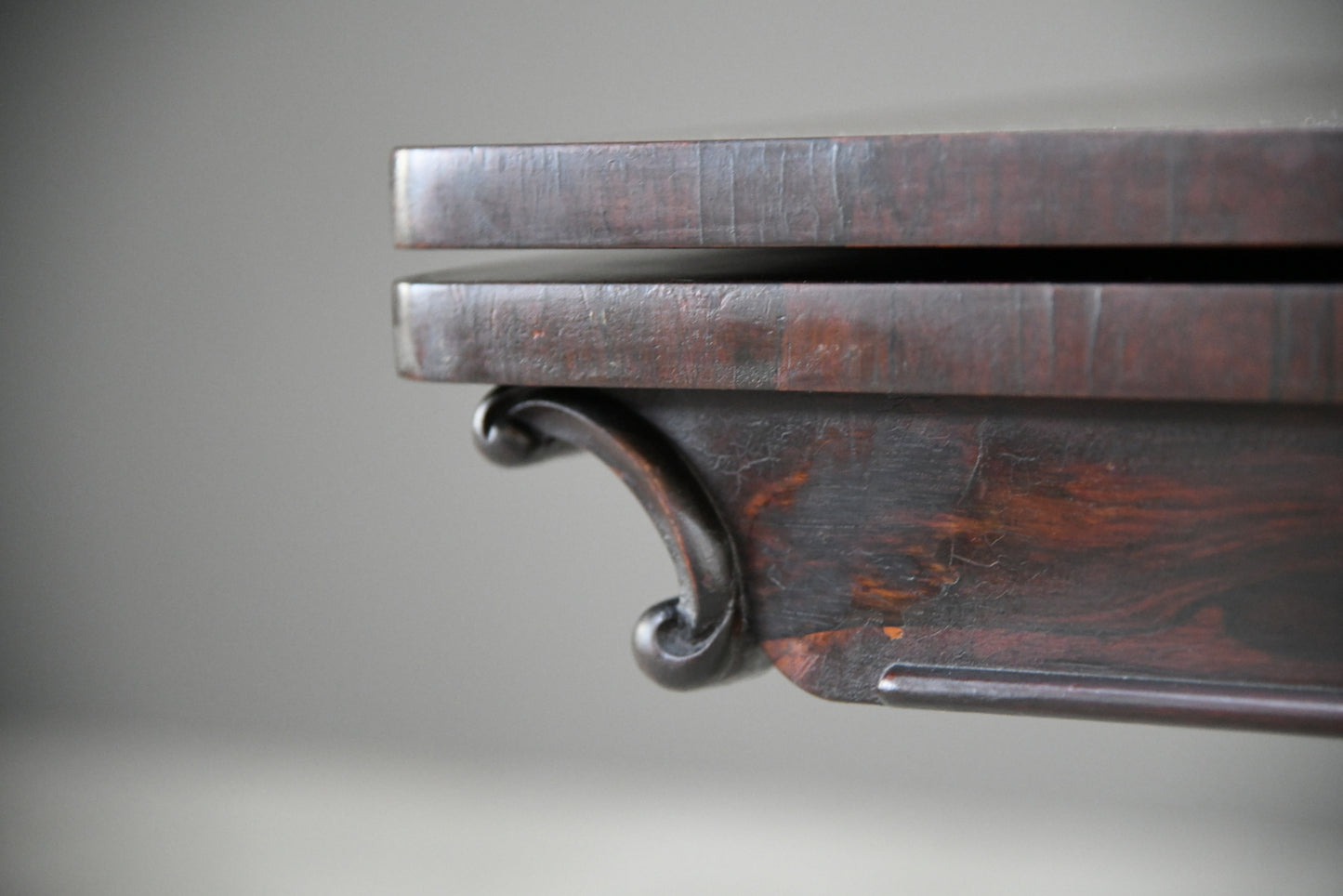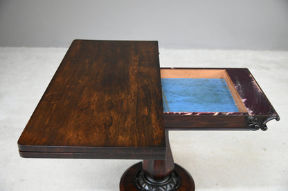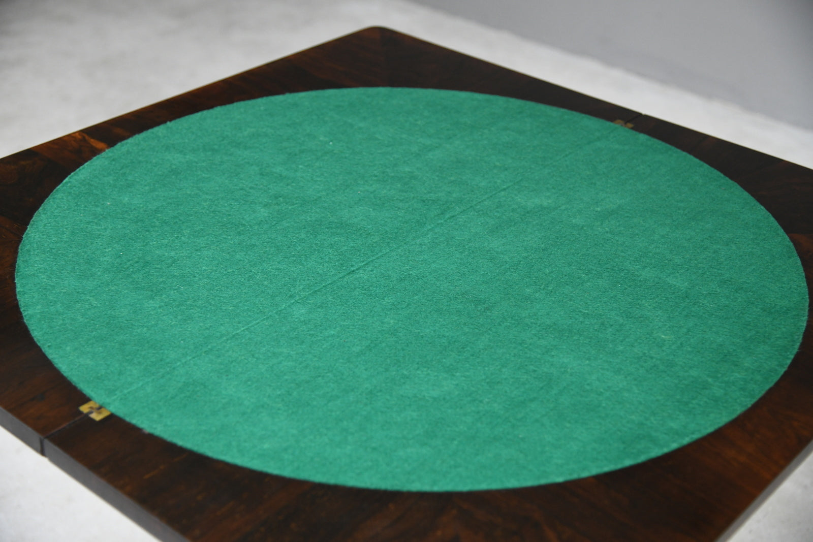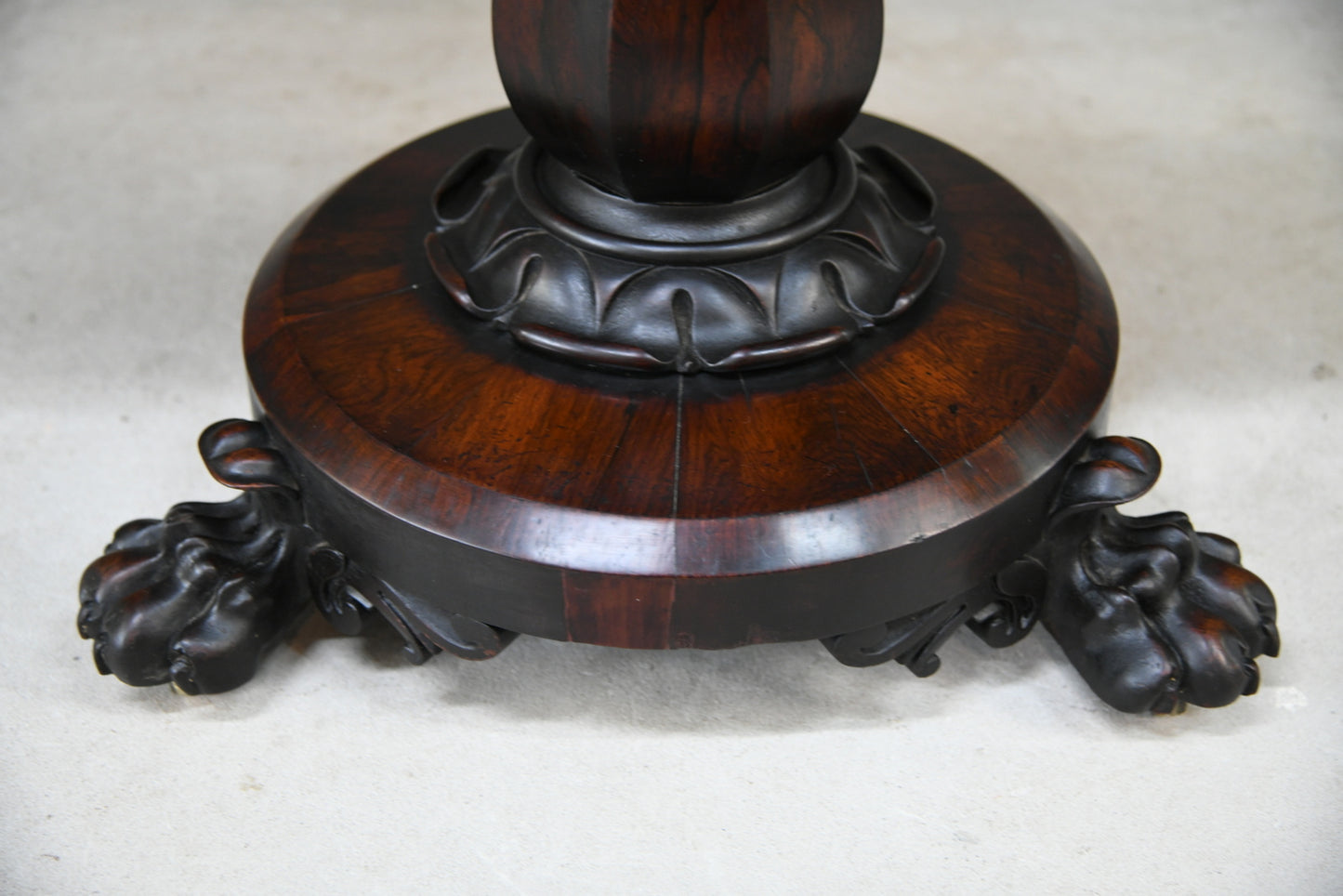 William IV Rosewood Games Table. Antique William IV Rosewood card table with fold over top with green baize lined centre on bulbous column round base and three carved lion paw feet.