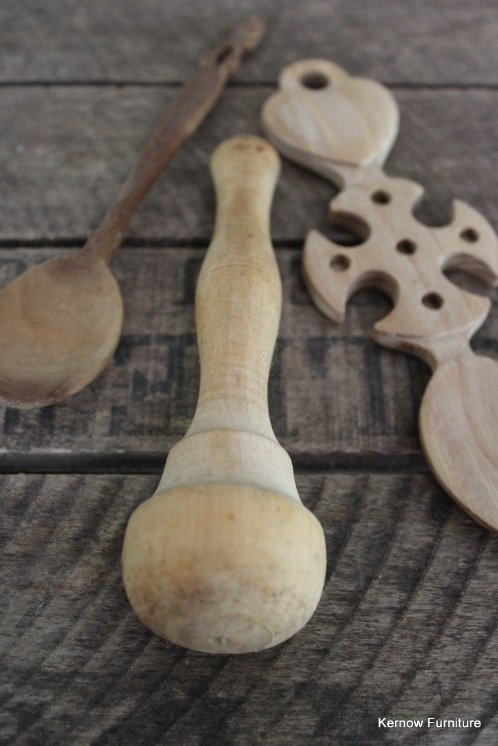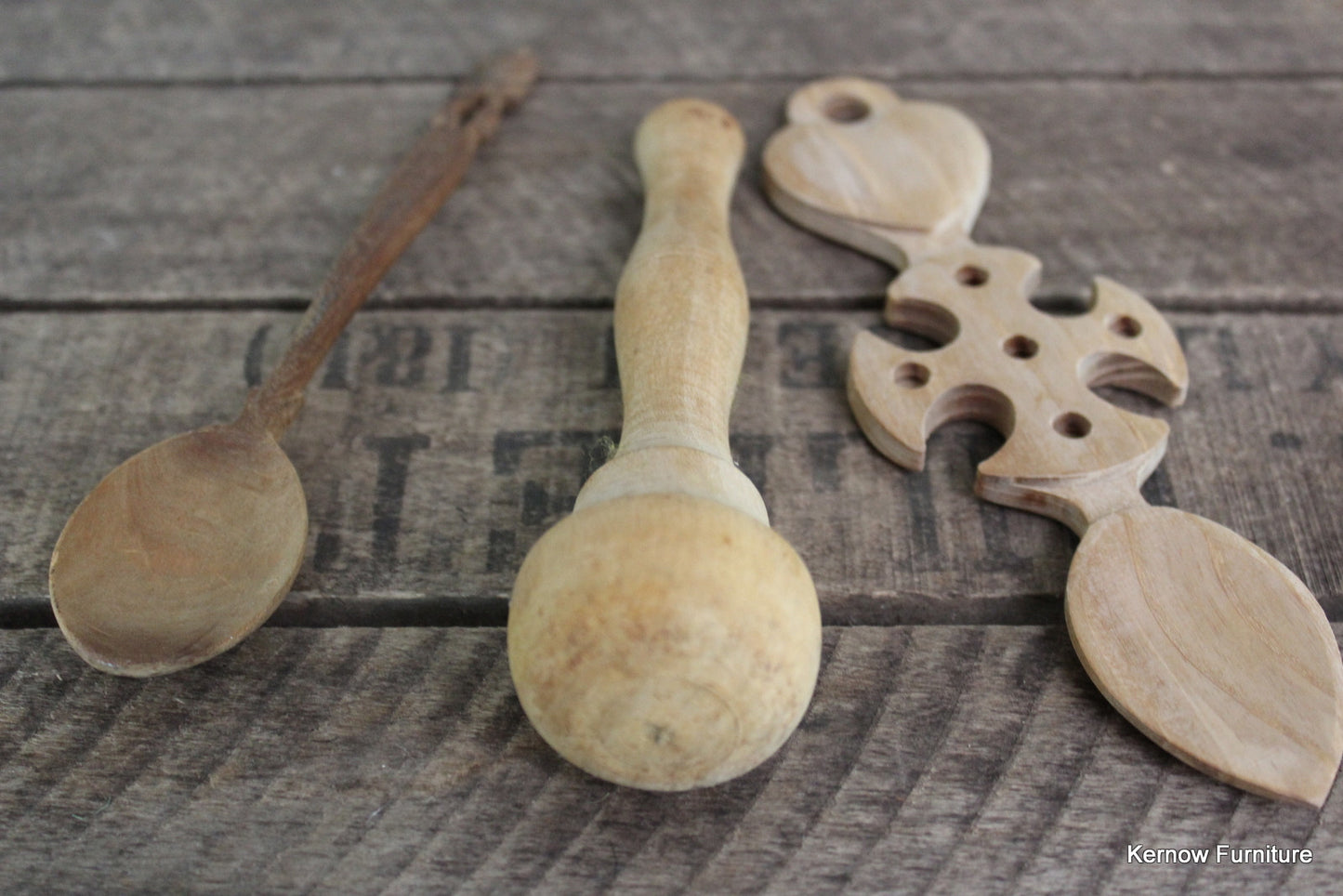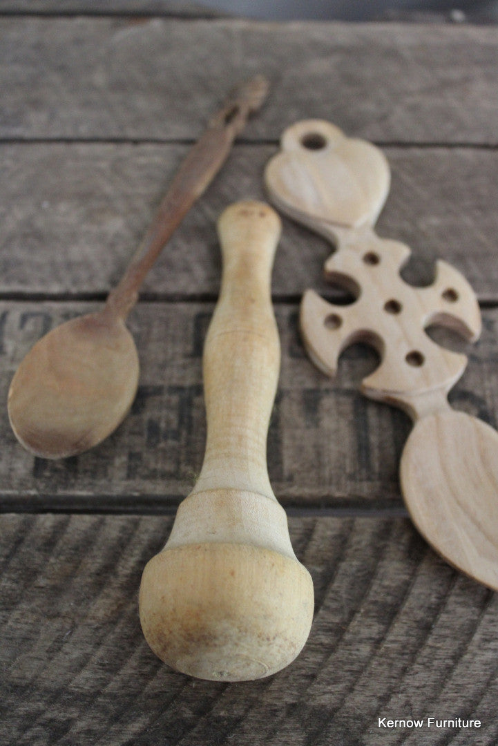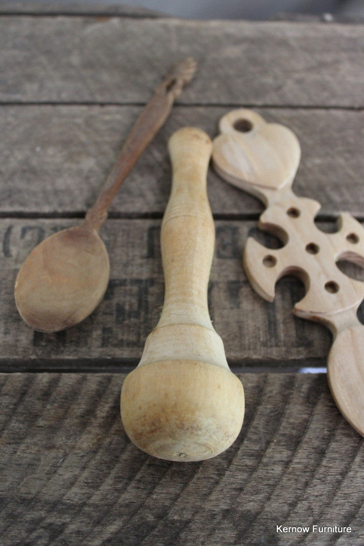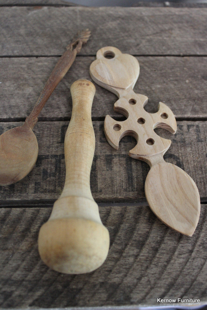 Wooden welsh love spoon, pestle & Afican hand carved spoon.